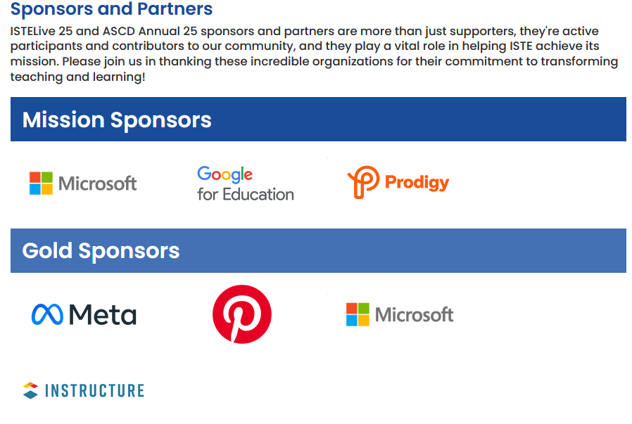 Of course, follow the funding and see the list of sponsors and partners for ISTE+ASCD’s annual conference– “more than just supporters…active participants and contributors to our community…[who] play a vital role in helping ISTE achieve its mission”: