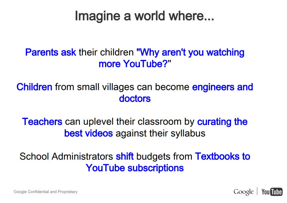 Internal Google documents show a slide that posits this question: Imagine a world where parents ask their children “Why aren’t you watching more YouTube?”