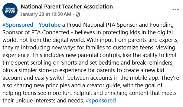 Despite growing concerns and independent research about the harms of excessive screen time on children and the addictive nature of YouTube’s platform, the National PTA continues to boast that YouTube is a proud sponsor to this day. Just this January, this post appeared on their LinkedIn page: