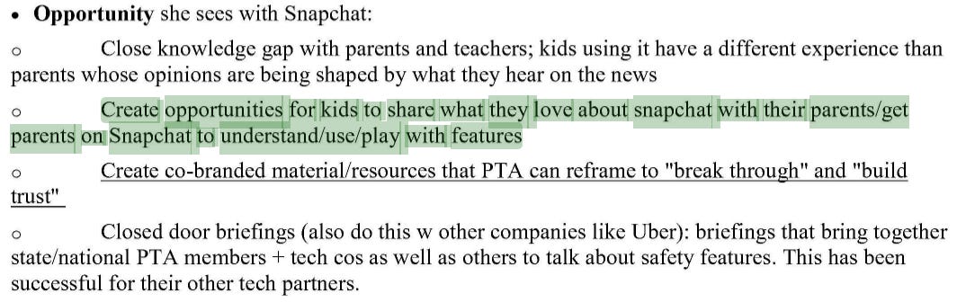 But yet again, in spite of the problems with Snap, in 2024, leadership at the National PTA was in conversation with Snap to help build trust for their product. (As the National PTA’s “corporate partnership” contact admitted, “it’s just bananas to me that we aren’t collaborating with Snap on engaging and educating parents, all things considered.” According to notes taken by Snap’s policy person, it appears the National PTA’s goal in working with Snap was to “create opportunities for kids to share what they love about Snapchat with their parents” and “get parents on Snapchat to understand, use, and play with features.”