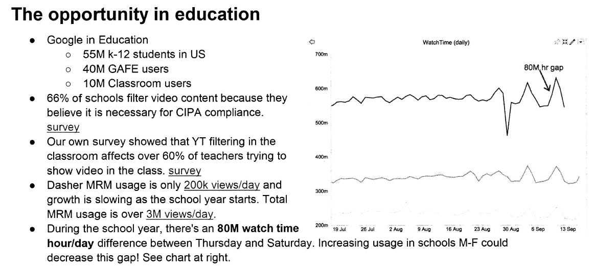 The onslaught of EdTech products into schools is many years in the making, but over a decade ago, Google realized that YouTube viewership was dropping during the day because kids were in school. In order to increase viewers, Google and YouTube executives realized they would have to find a way to get schools on board with promoting their product.