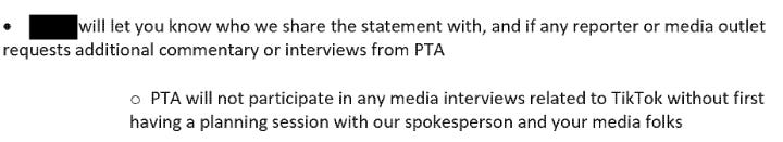 In the same discovery documents for the upcoming court hearing, emails between TikTok and the National PTA reveal that in exchange for funding from TikTok, the National PTA granted TikTok control over how the National PTA could speak about their product, stating the “PTA will not participate in any media interviews related to TikTok without first having a planning session with our spokesperson and your media folks.”