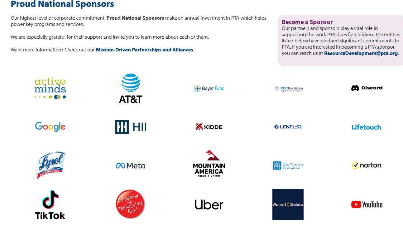 Listed on the National PTA website is a section called “Proud Sponsors.” (Notably it’s a little hard to find– none of these companies are listed on their landing page, so unless you dig, you wouldn’t know.)