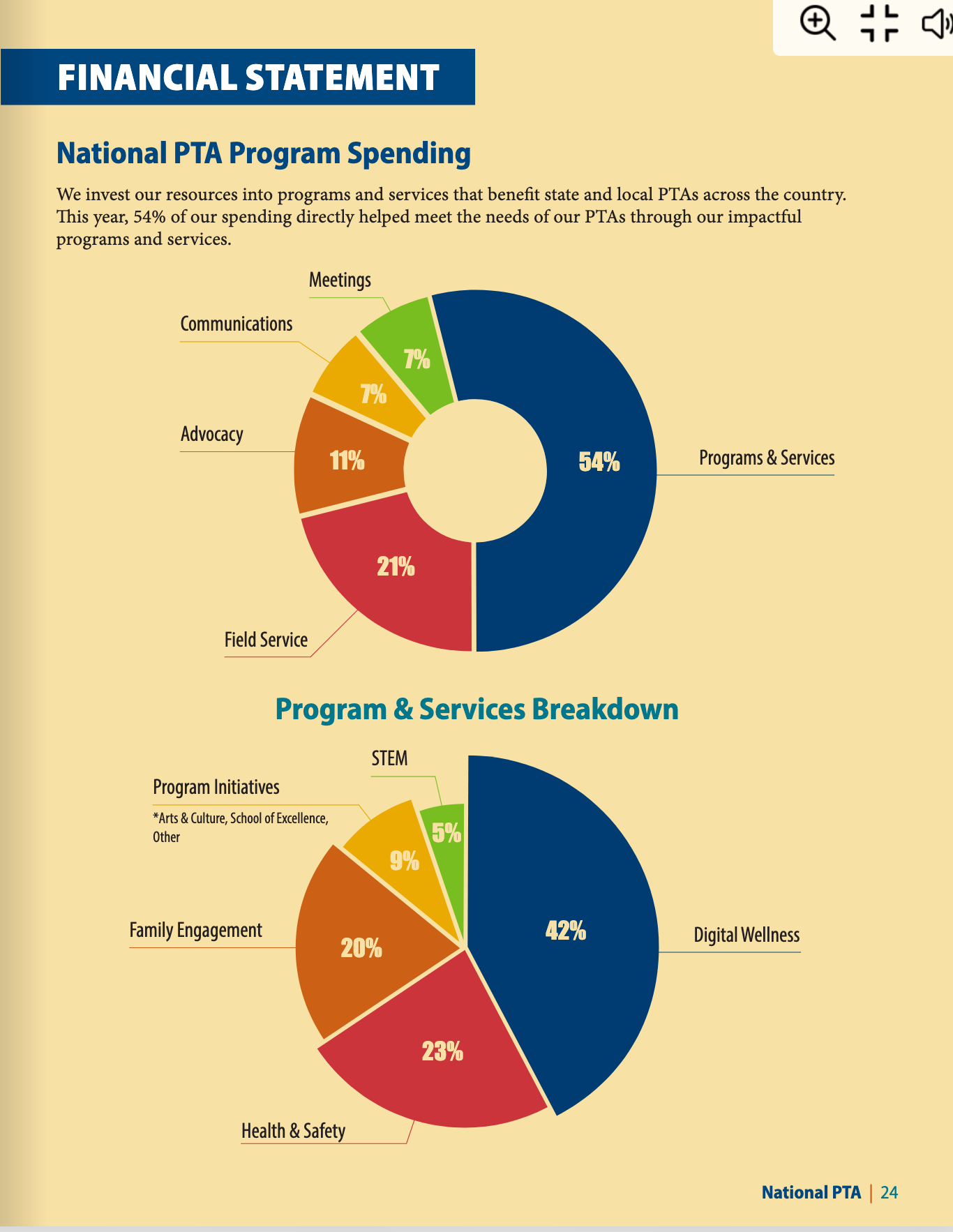 Yet in their 2024 annual report, the National PTA reports that 42% of their program and services costs goes to “digital wellness programs”– by far their largest expenditure. The National PTA spends almost ten times as much on “digital wellness” as they do on STEM programs and twice as much as they do on “family engagement.”